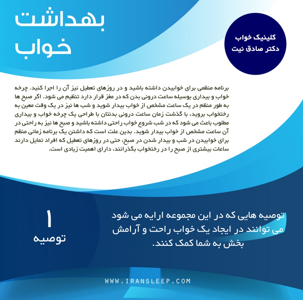 برنامه منظمی برای خوابیدن داشته باشید و در روزهای تعطیل نیز آن را اجرا کنید. چرخه خواب و بیداری بوسیله ساعت درونی بدن که در مغز قرار دارد تنظیم می شود. اگر صبح ها به طور منظم در یک ساعت مشخص از خواب بیدار شوید و شب ها نیز در یک وقت معین به رختخواب بروید، با گذشت زمان ساعت درونی بدنتان با طراحی یک چرخه خواب و بیداری مطلوب باعث می شود که در شب شروع خواب راحتی داشته باشید و صبح ها نیز به راحتی در آن ساعت مشخص از خواب بیدار شوید. بدین علت است که داشتن یک برنامه زمانی منظم برای خوابیدن در شب و بیدار شدن در صبح، حتی در روزهای تعطیل که افراد تمایل دارند ساعات بیشتری از صبح را در رختخواب بگذرانند، دارای اهمیت زیادی است.